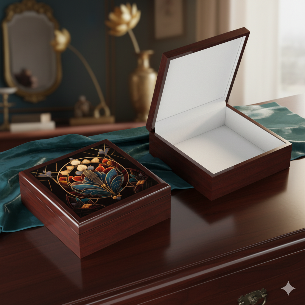 Each box is a work of art, featuring unique designer prints ranging from intricate geometric patterns and modern abstract designs to delicate floral motifs and classic artistic reproductions. The natural warmth and durability of the wood provide a beautiful canvas for these prints, ensuring your jewelry box is as distinctive as the treasures it holds.